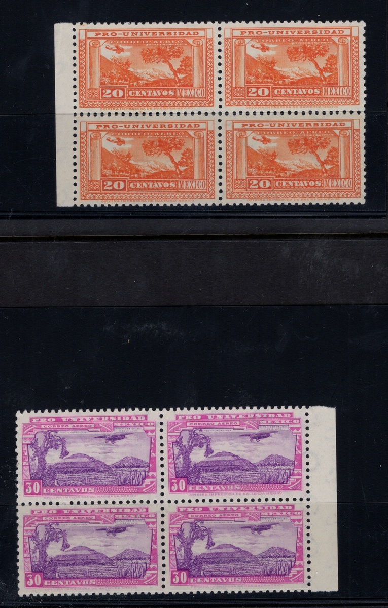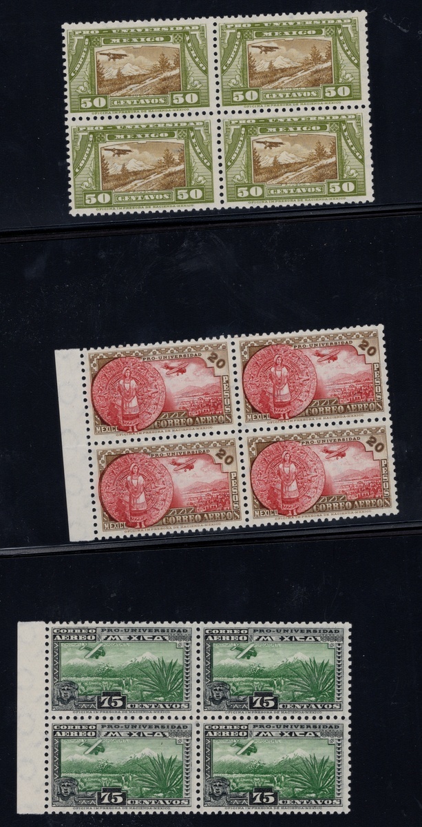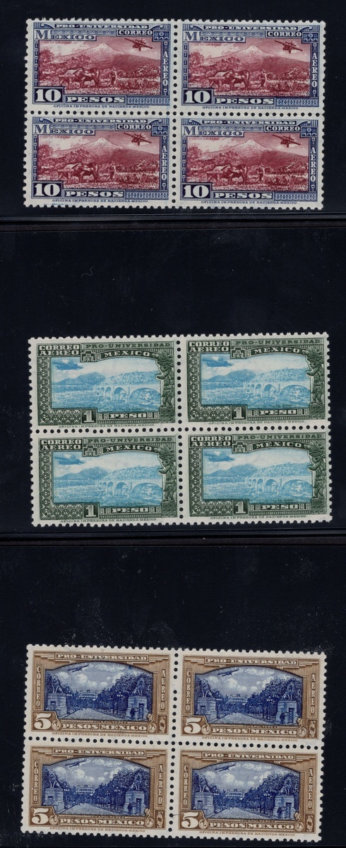 1934 "Pro Universidad" 20c. to 20p., complete airmail set in never hinged blocks of four, good centering except for the 1p. value, presenting a slightly to the right centering. Just one example of the 10p. has a slight gum blemish. Very scarce. Scott C54-C61, $19,000 as n.h.,