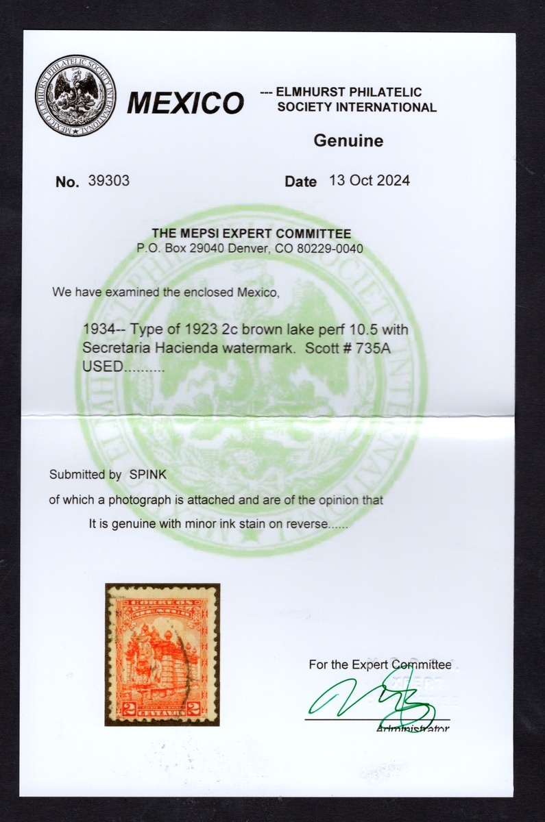 1934 "Salto del Agua" 2c. Red, "SHCP" ("Secretaría de Hacienda") revenue watermark and 10½ perforation, lightly cancelled with c.d.s., two short perforations at bottom with minor ink stain on reverse. According to Garcia Prada, only about 20 examples are known, making this one of the scarcest and most desirable semi-modern rarities of Mexico. 2024 MEPSI certificate. Scott 735a, $6,000.
