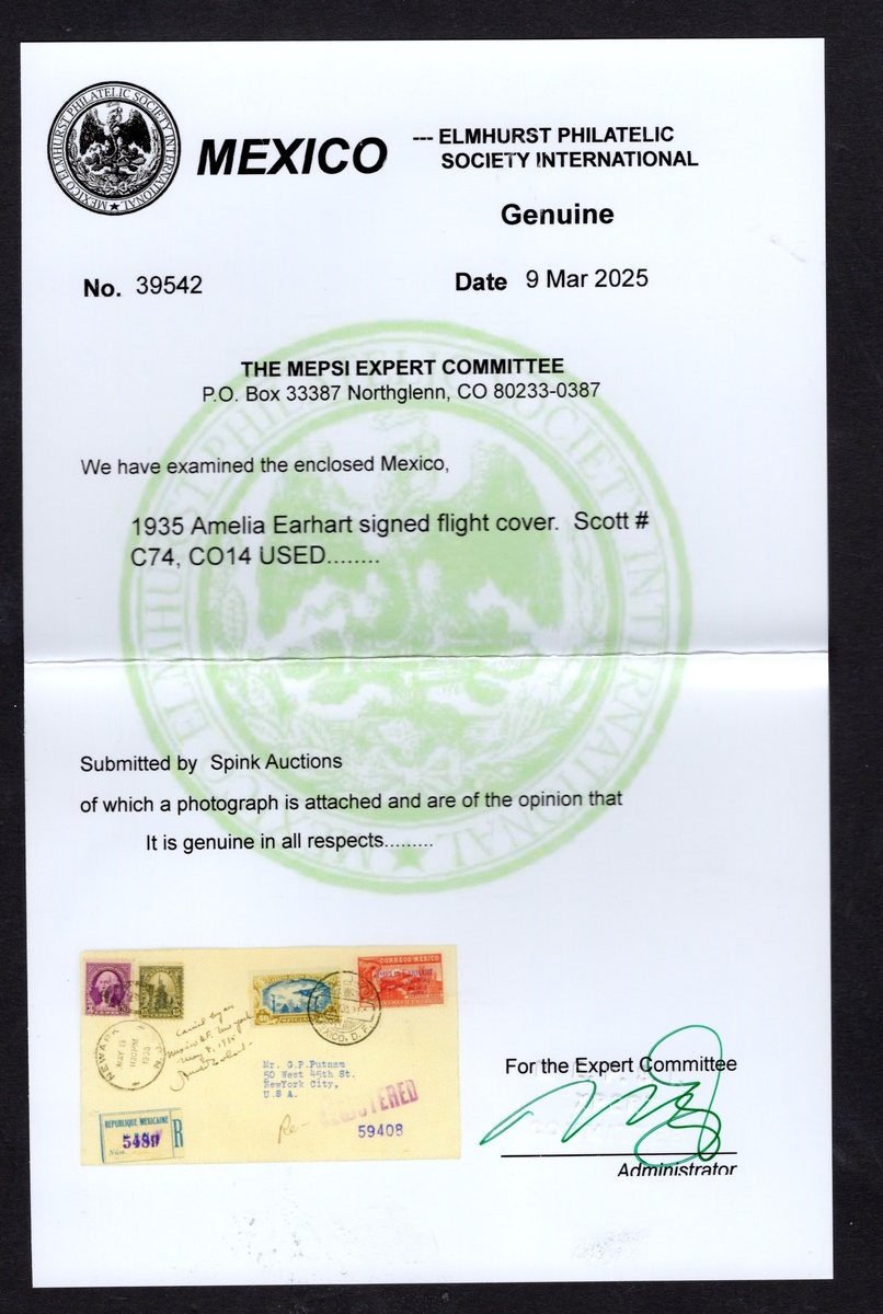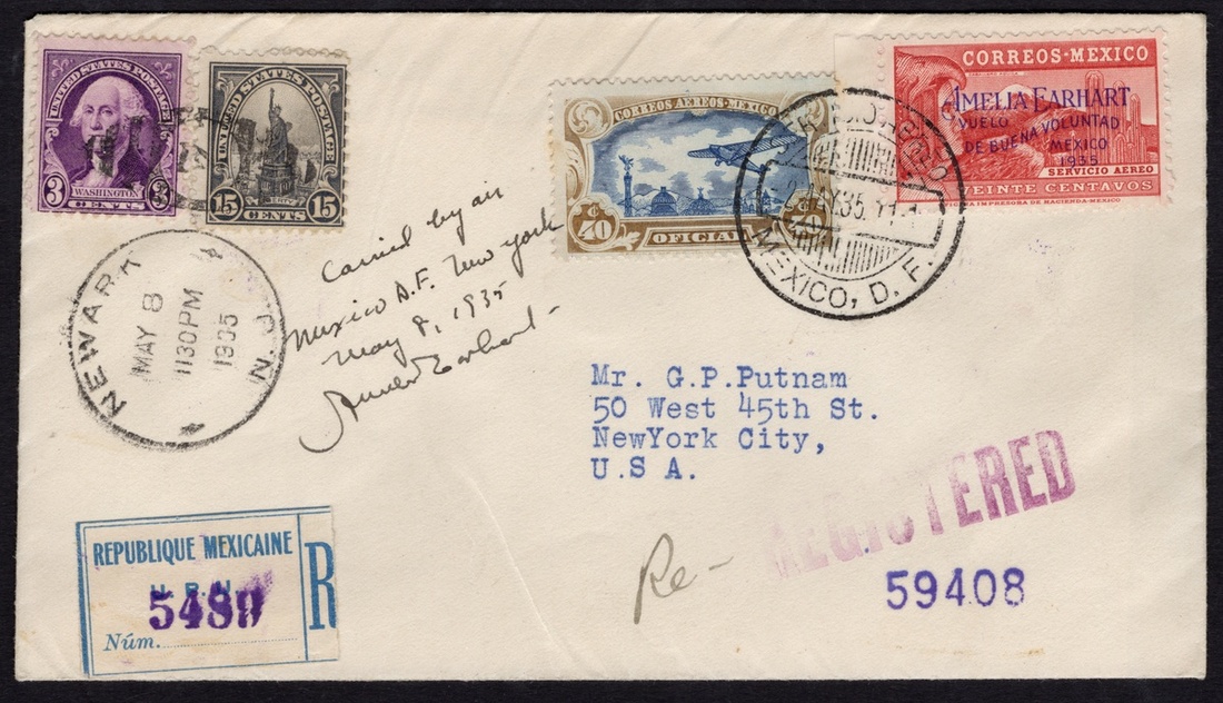 1935 Amelia Earhart 20c. Red, and Official Airmail 40c. Brown, on very attractive flown registered cover from Mexico City to New York, dated May 8th 1935, autographed by Amelia Earhart and addressed to her husband G.P. Putnam, additionally franked with U.S. 3c. and 15c. postage. Crease not affecting the stamps. In 1935 Amelia Earhart visited Mexico and the government issued an airmail stamp for the mail carried in the return flight. Only 300 stamps issued and another 480 were overprinted "Muestra" as specimens. It is believed than only 35-40 covers were ever carried in this flight. Extremely rare. 2025 MEPSI certificate. Scott C74, CO14, $4,000 as used off-cover.