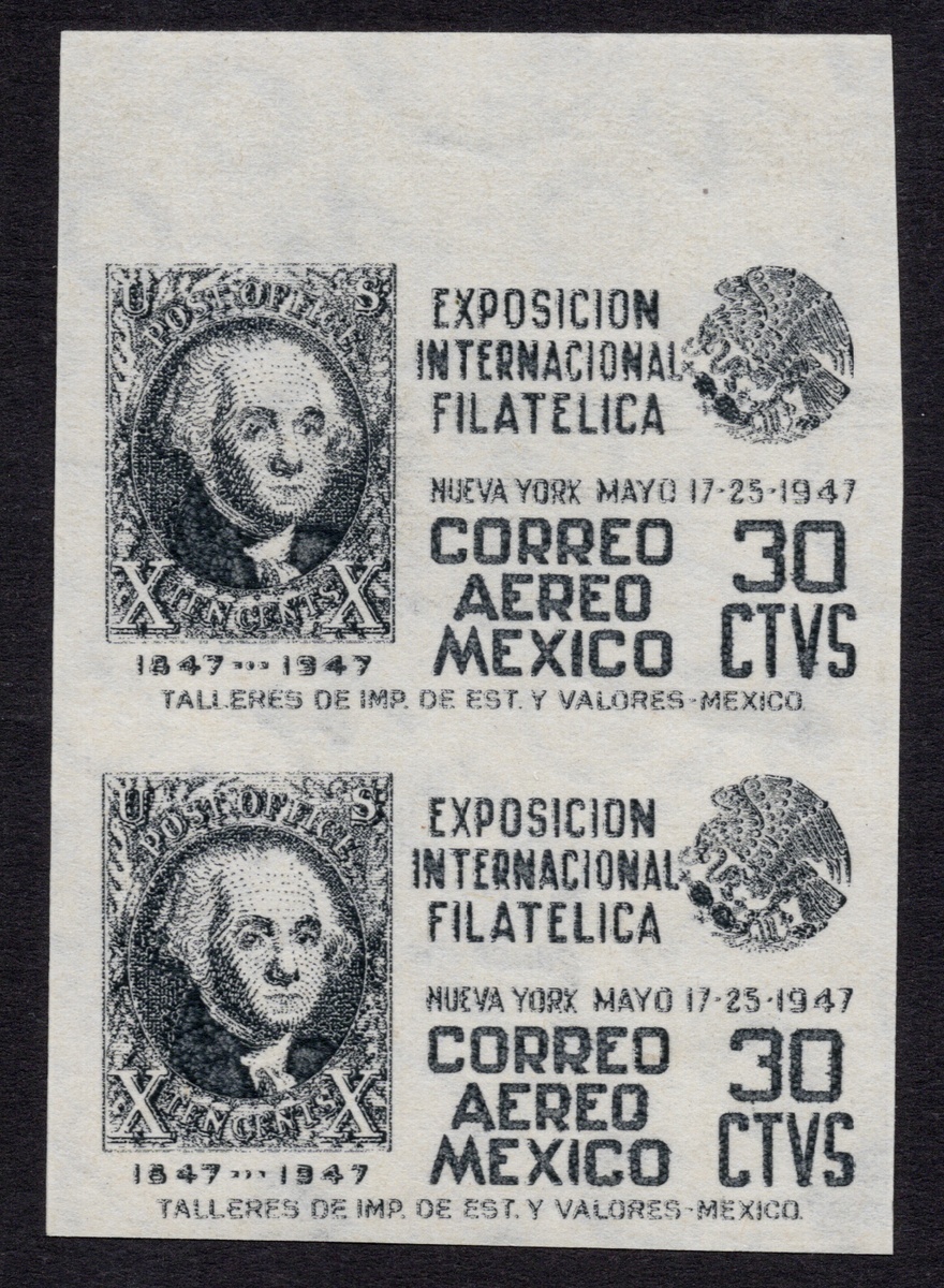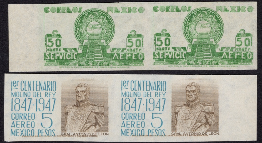1947 Trio of imperforate pairs, very fresh and in unused condition, including 30c. Black International Philatelic Exhibition (n.h. vertical pair), 50c. Green Pyramid (horizontal and o.g.) and 5p. Chapultepec Battle (horizontal n.h., signed Shelton). Scott C168a, C175a, C184a, $1,375.