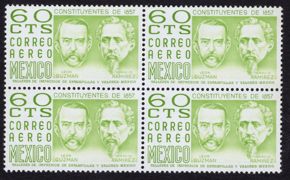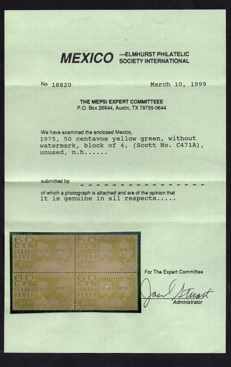1975 Airmail Leon Guzmán and Ignacio Ramírez 60c. Yellow Green, in an unwatermarked block of four n.h. Very rare. 1999 MEPSI certificate. Scott C471 A, $4,800 as singles.,