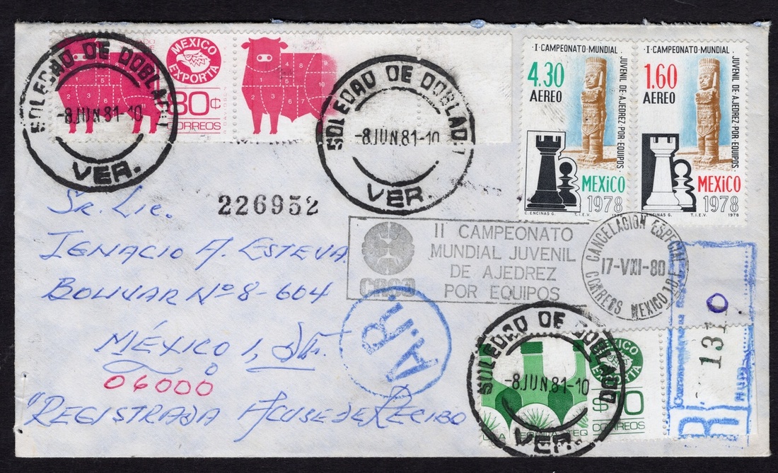 80c. Red Bull "Exporta" pair, showing missing printing in half of the stamp at right, tied by c.d.s. to registered cover with acknowledgement of receipt from Soledad de Doblado on Jun 8, 1981, additionally franked by "Tequila" 10p. Brown and Chess 1.60p., 4.30p. Probably unique. Scott 1113, 1125, C577, C578.