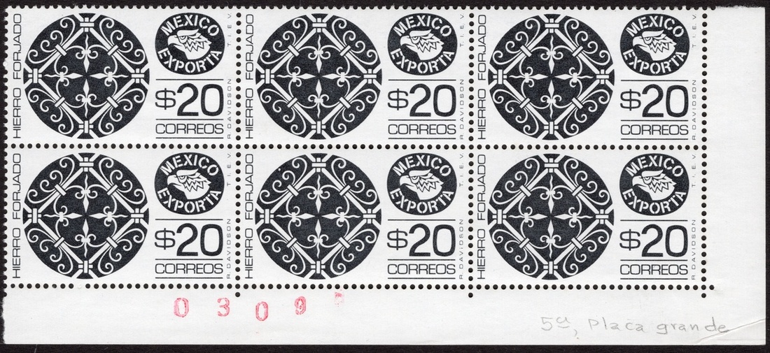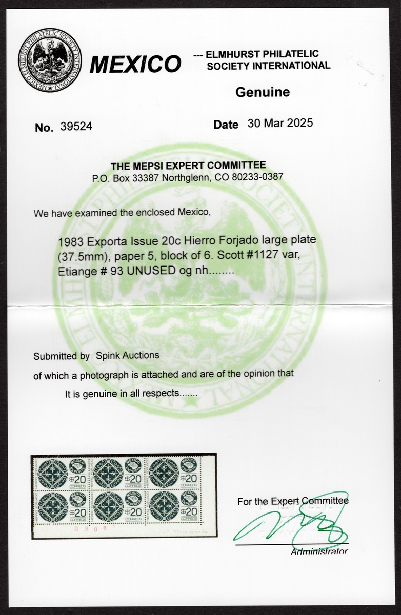 1983 "Exporta" Issue 20 Pesos "Hierro Forjado", 37.5mm, paper type five, block of six with plate number and bottom corner selvage, never hinged. These stamps are from the scarce 37.5mm variety, with only 8,300 sheets issued. Enrique Sánchez values these stamps based on recent transactions, pricing them at $300-500 each. 2025 MEPSI certificate. Scott 1127v, Etiangui 93, $1,800-3,000.,