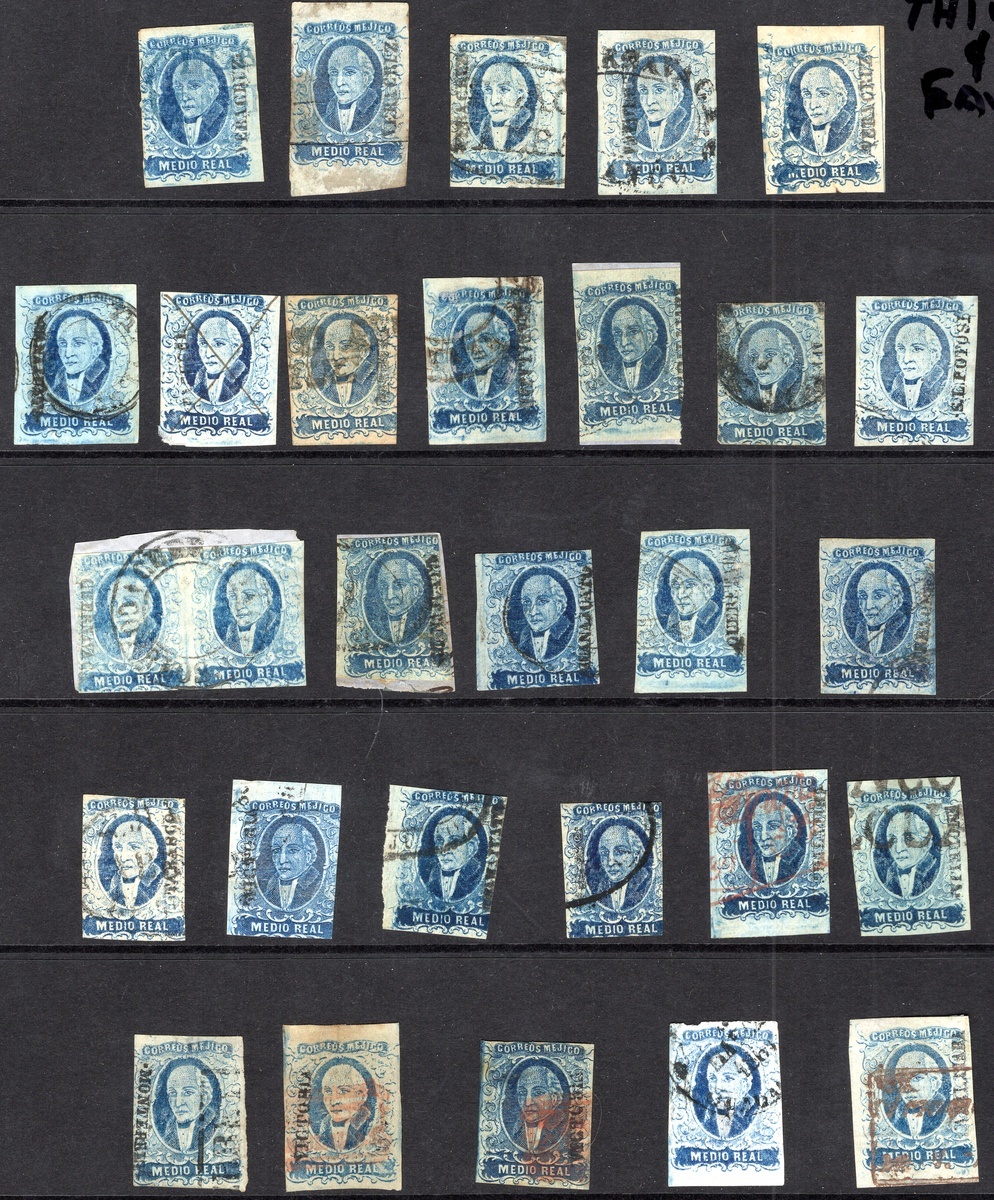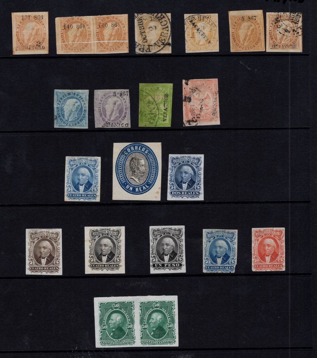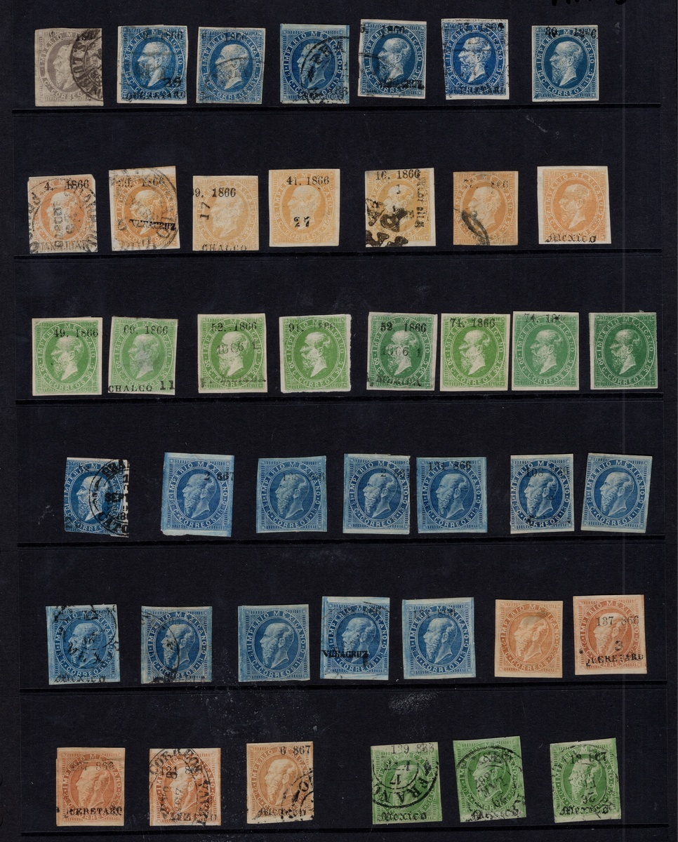 1856-1867 Group of 92 classic stamps and proofs with thins or defects. Some of them very attractive. Includes twenty nine 1856 Hidalgos ½r. Blue, 1864 Eagles and Maximilians stamps and color proofs, 1864 Hidalgo proofs and 1874 Proofs. Scott 1, 15v-17v, 24-25, 26-34, 110v; NF $2,930.