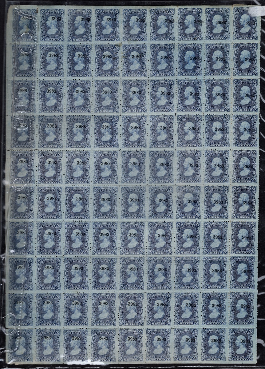 Balance of a collection with eclectic items: over 90 singles, used and unused (1879 Juárez and 1884-1886 Hidalgo "Medallion"s), one full sheet of 100 of 25c. Blue #3983 from the 1874 "Hidalgo" issue, and nine covers from various issues.,, ,