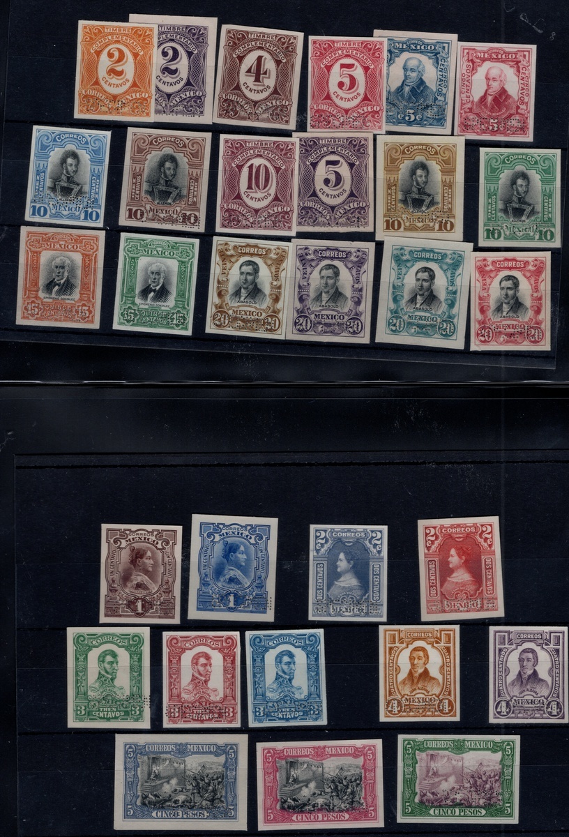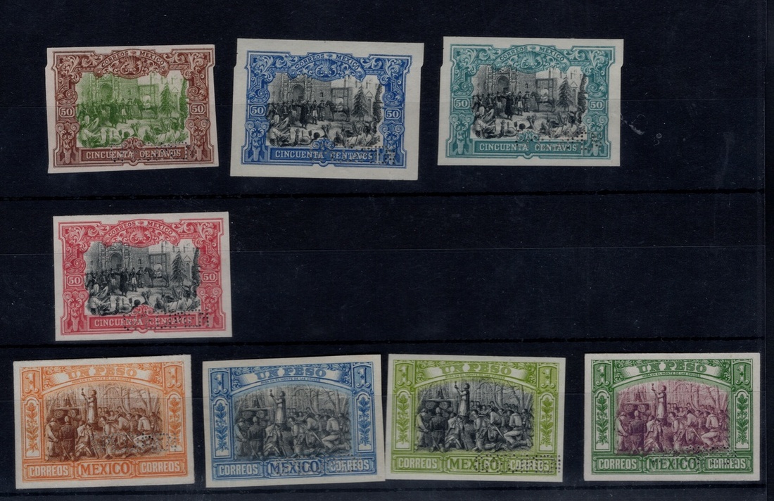 1908 and 1910 Porfirian "Complementarios" and "Centenario" issues, group of 38 trial color proofs produced by Bradbury Wilkinson, printed on stout paper and perforated "Specimen" in a straight line at the bottom right of the design. Mixed condition. Scott 310-320 var, J2-J5 var.