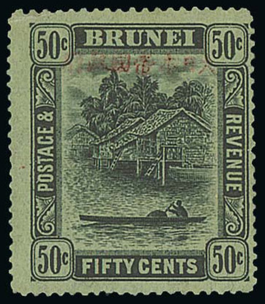 50c. black on emerald with red overprint, centred to right, unused with large part original gum and of fine appearance; small thin and top left corner with small repair. Rare. Ceremuga Certificate (2005). ISC J16a, $1,800; S.G. J16a, £950. Photo