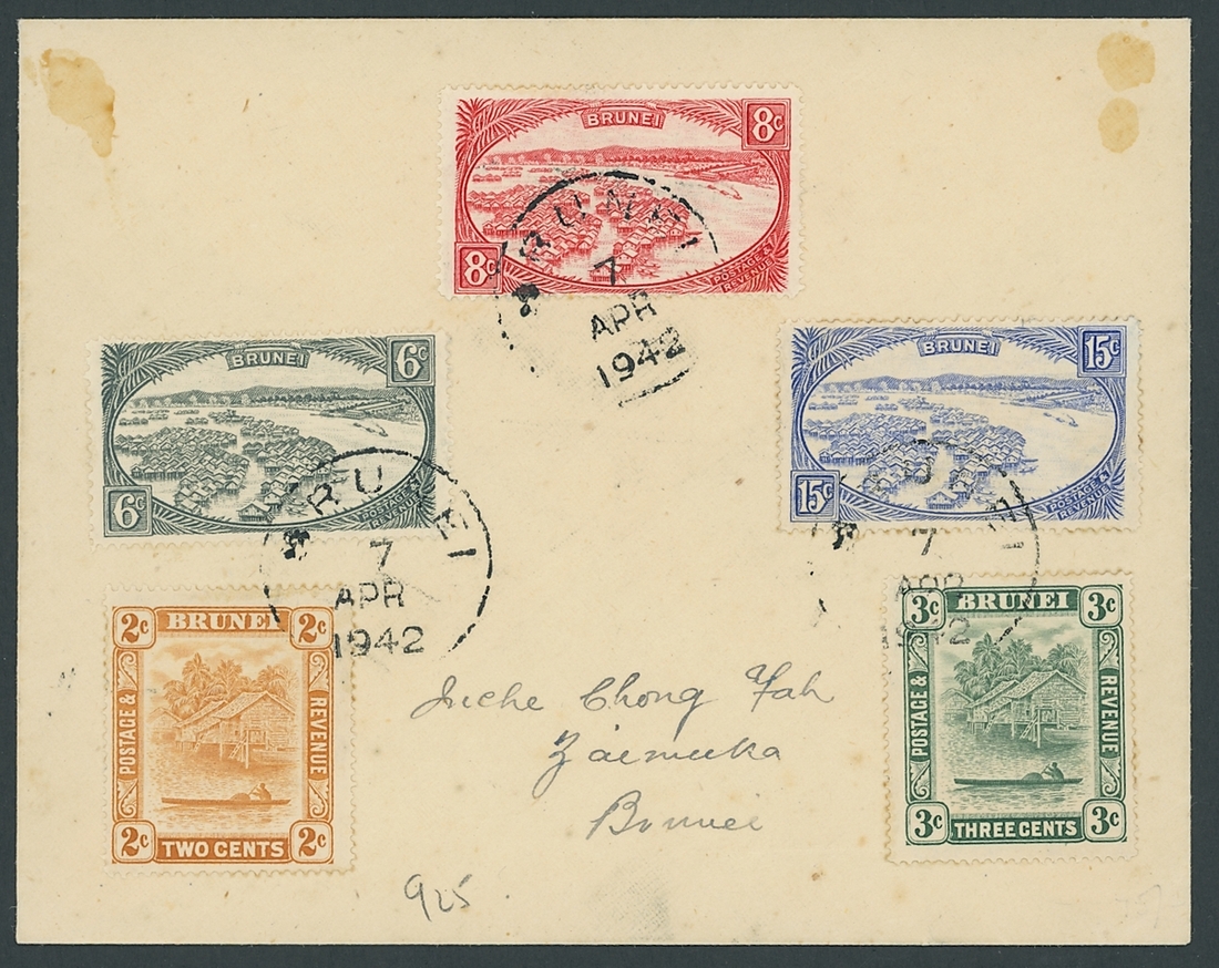 2c. orange, 3c. blue-green, 6c. greenish grey, 8c. red and 15c. ultramarine, all tied by Brunei c.d.s. on locally addressed 1942 (7 Apr.) philatelic envelope, fine