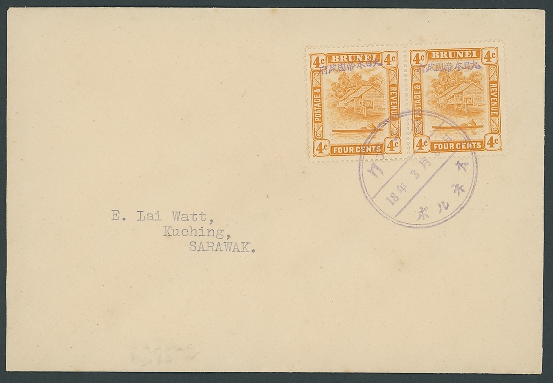 1943 (18 Mar.) locally addressed envelope bearing 4c. pair with violet overprint, neatly tied by Kuching Japanese c.d.s. (Type JD1) in violet; no other markings