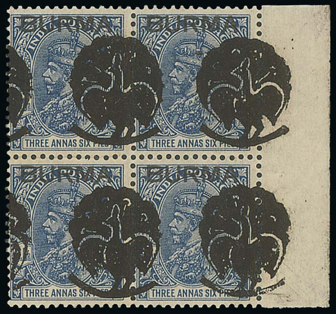 3a.6p. deep blue block of four with margin at right and showing all four types, variety overprint grossly misplaced 5mm. to right, unused with full original gum, fine. S.G. J2, £360+. Photo