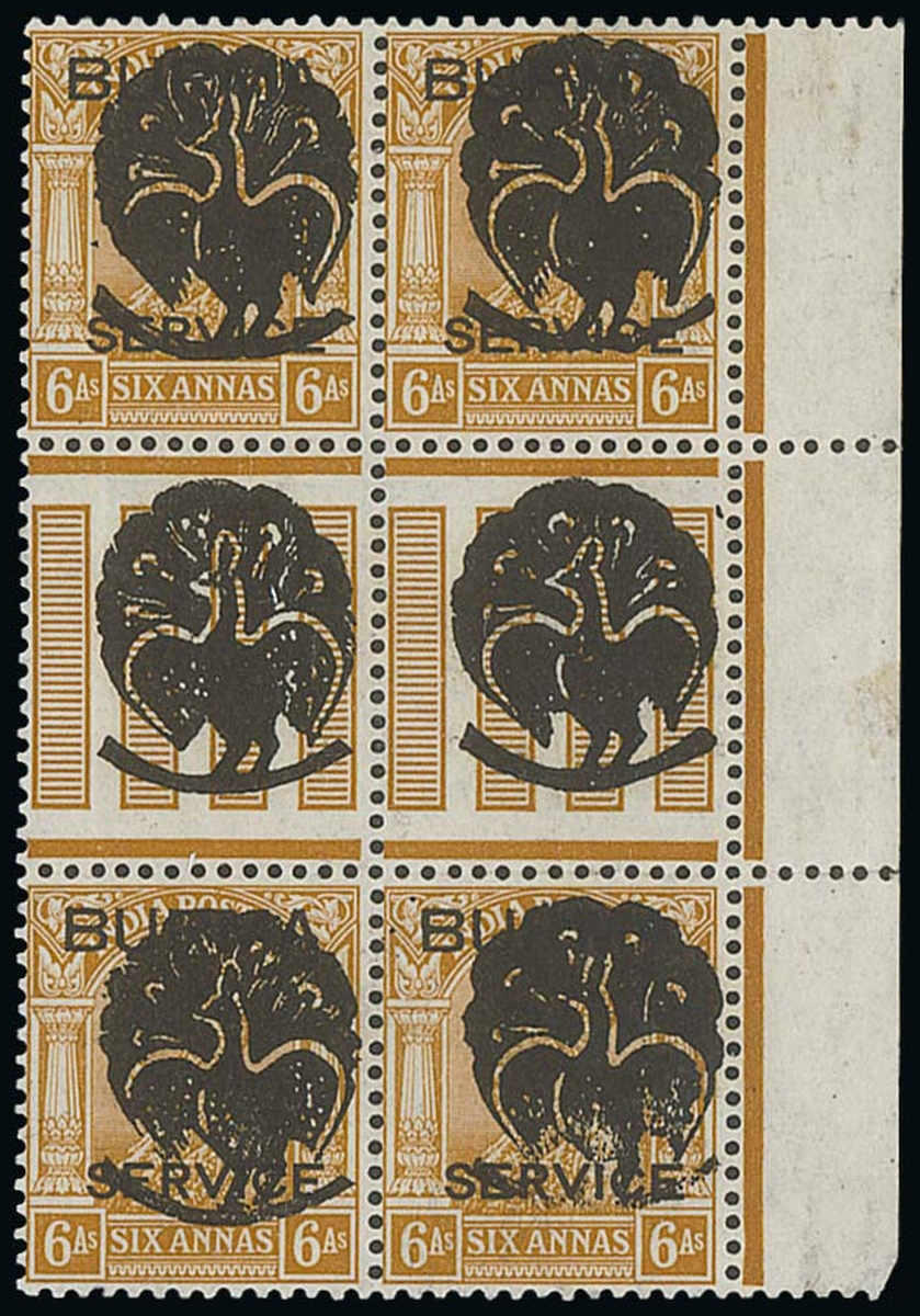 Note: The 6a. value was printed from old De La Rue plates. Sheets were 256 in four panes of sixty-four. Each pane with four rows of sixteen was separated by interpanneau margins with printed pillars. The Myaungmya type was made up of a block of four types and in the height of the sheet of two stamps width there were eight blocks each showing the four sub-types. On the margins sub-types c and d are twice as rare as sub-types a and b. The printing should have resulted in the lower sheet margin having parts of sub-types c and d.