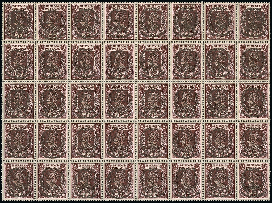 1a. purple-brown block of forty (8x5), [1-40] with [7], [34] and [39] showing "cracked" peacocks, unused with full original gum, fresh and fine. A wonderful positional block and exhibition item. S.G. J15, £800+. Photo