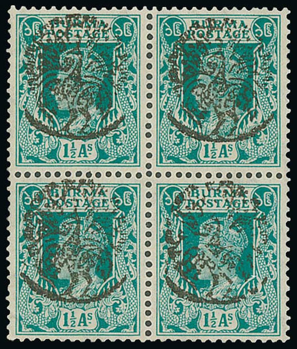 1½a. turquoise-green block of four, the lower right stamp showing "cracked" peacock [34], unused with full original gum, the lower left stamp with corner crease not affecting fine appearance. Rare. JSCA B17, Y120,000+; Unlisted in S.G. Photo