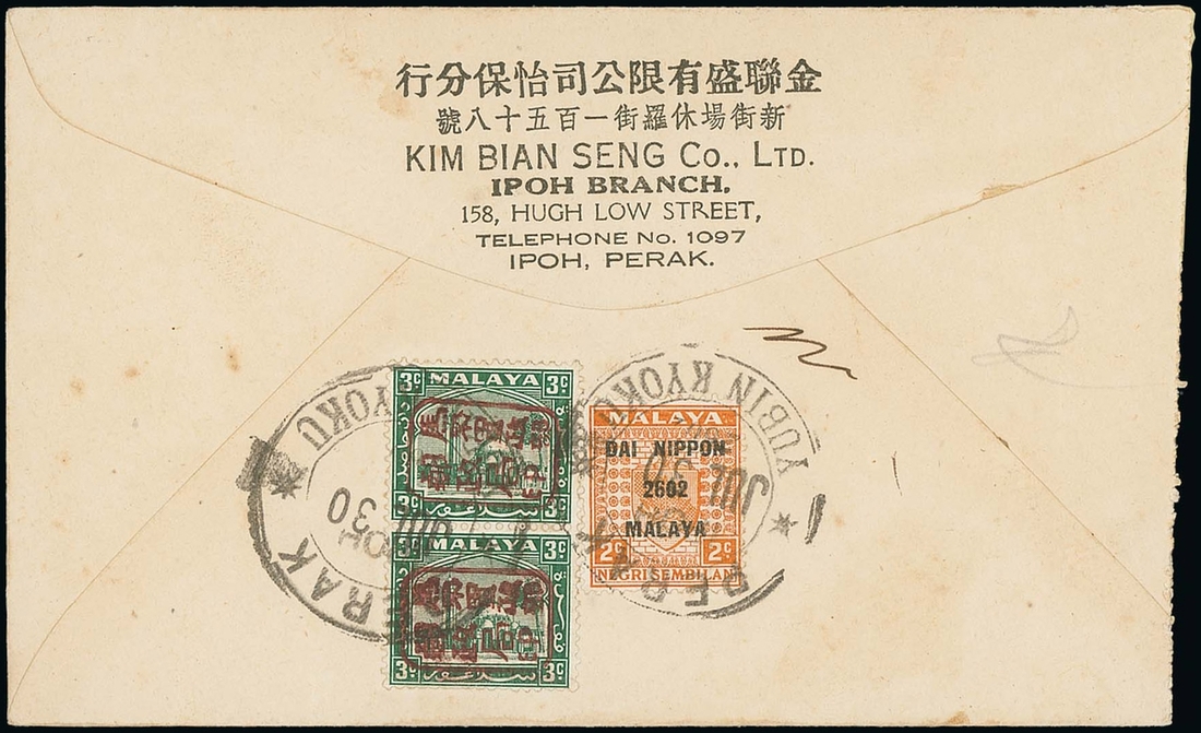 1942 (30 July) commercial envelope from Ipoh to Kuala Lumpur bearing, on reverse, Selangor 3c. vertical pair with single frame chop in brownish red and Negri Sembilan