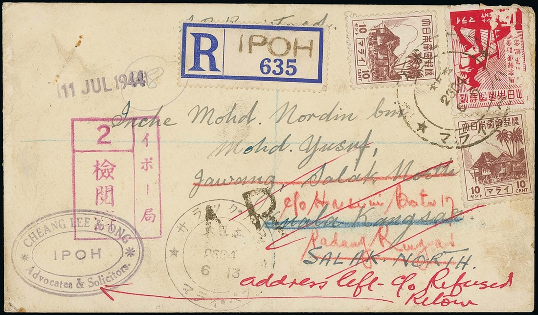 1944 (6 June) envelope registered from Ipoh to Kuala Kangsar, redirected to Salak North, again to Padang Rengas and finally back to Ipoh, bearing Ploughman 15c. (damaged) and Pictorial 10c. (2) tied by Japanese Type d.s., showing unframed