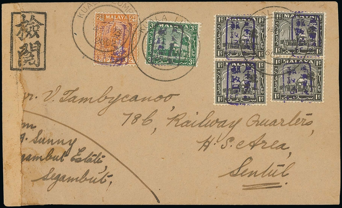 1942 (3 Apr.) envelope from Kuala Lumpur to Sentul, bearing Perak 2c. with overprint double and Selangor 1c. vertical pairs (2) and 3c. all with vertical violet single frame chop, all tied by Type D32 double-ring d.s. (earliest recorded date), showing sealing tape at left tied by censor chop and Type D4 arrival c.d.s. on reverse. Attractive. Photo