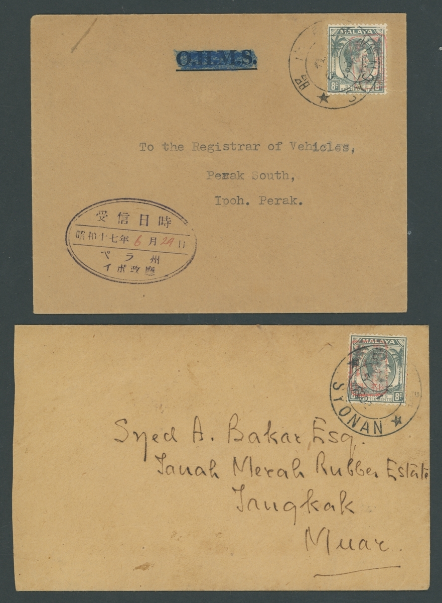 1942 envelopes (4) including to Ipoh, Muar and Penang, each bearing 8c. with red single frame chop, and locally addressed bearing 3c. (2) with red single frame chop and