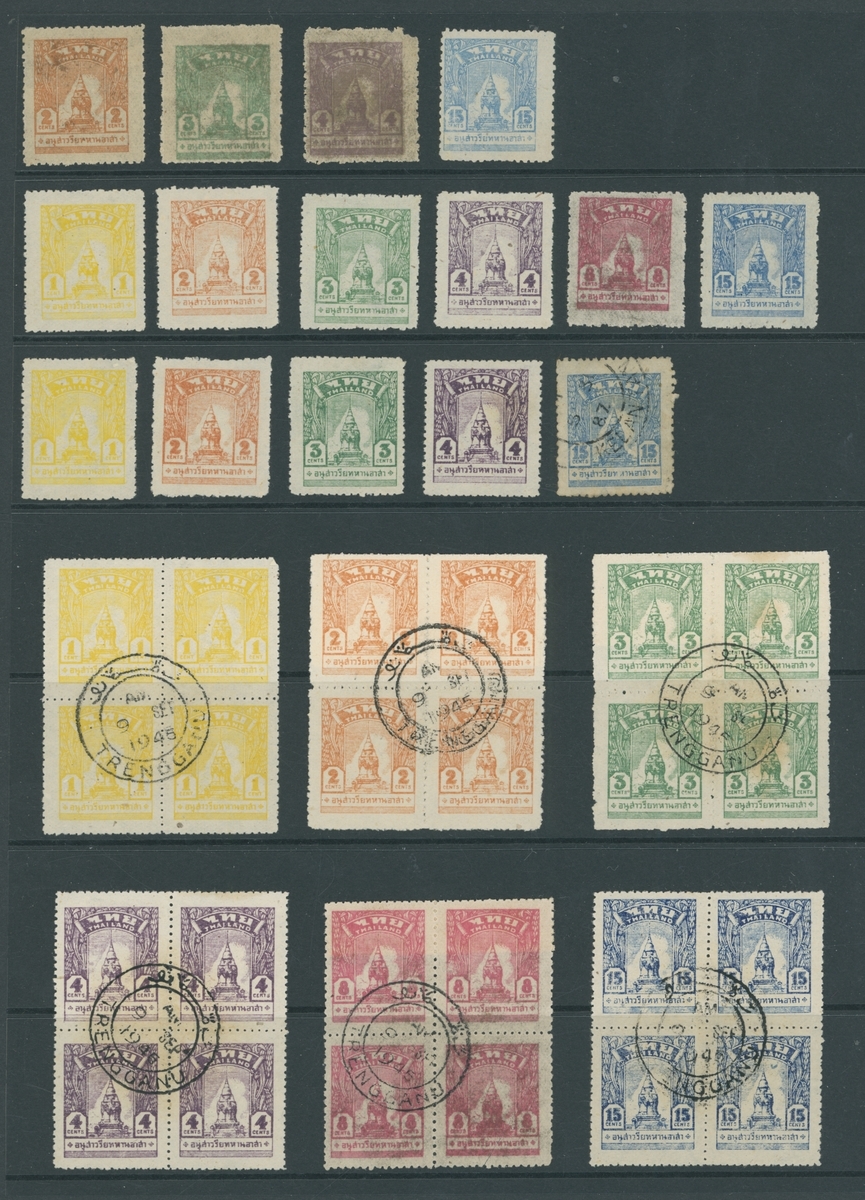 Perf 12½ 1c.to 15c. in unused singles with additional 1c. to 4c. and in used blocks of four (one 8c. with heavy corner crease), each with central bi-lingual Trengganu double-ring c.d.s., with additional 15c. single, and perf 12x11 2c., 3c., 4c. (top right corner fault) and 15c.; fine. S.G. TM1-TM6, £1,354