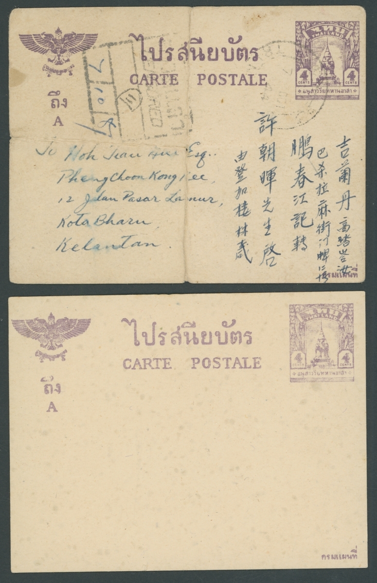 1944 War Memorial 4c. unused, fine; also 4c. used to Kota Bharu cancelled bi bi-lingual