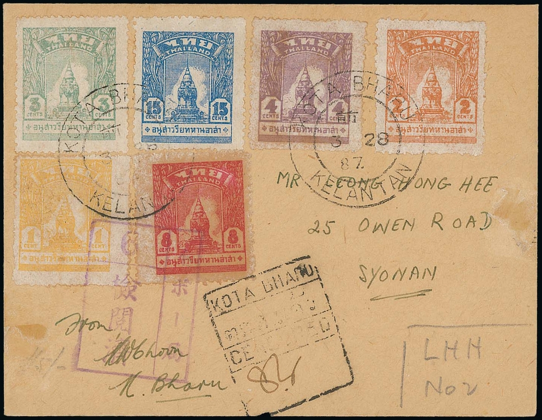 1944 (28 Mar.) envelope to Singapore, bearing 1c. to 15c. set of six, all tied by