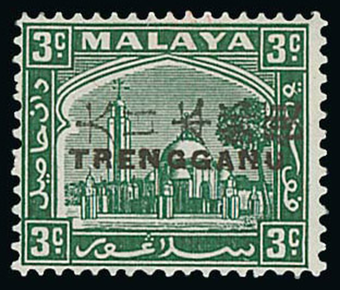 Selangor 3c. green with large part original gum, fine. ISC TT13, $2,000; S.G. TT14, £1,500. Photo