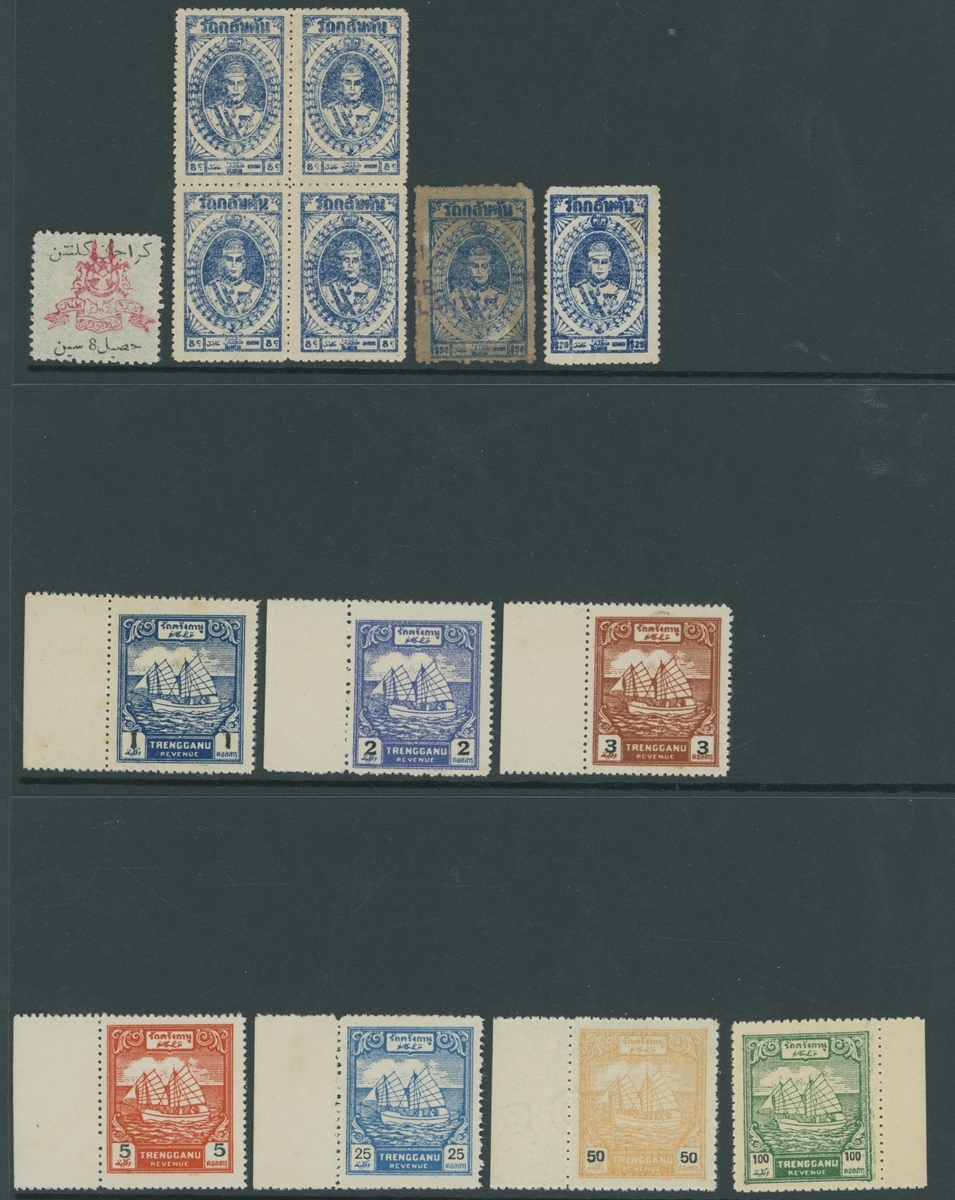 1943 8c. unused without gum as issued, 1944 8c. blue block of four and $25 (light tone at upper right) unused without gum as issued, and $50 used (discoloured from affixative), and Trengganu 1944 $1 to $100 (all marginal) unused without gum; fine