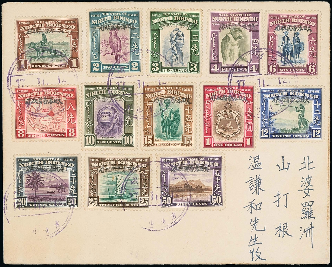 1c. to $1 set of thirteen with black overprint, all tied by Sandakan Japanese type c.d.s. (Type JD2; earliest recorded date) on locally addressed 1942 (12 Nov.) envelope, fine. B.P.A. Certificate (1994). ISC J1a-J13a, $18,480; S.G. J1a-J15a, £7,980 off cover. Photo