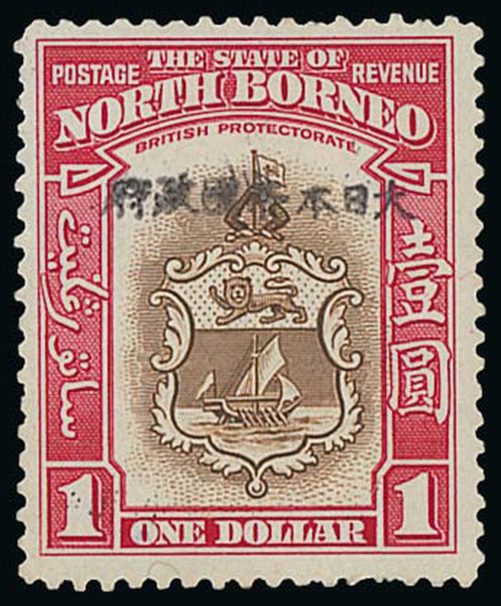 $1 brown and carmine with black overprint, unused with large part original gum, fine. Rare. B.P.A. Certificate (2019). ISC J13a, $5,000; S.G. J13a, £1,700. Photo