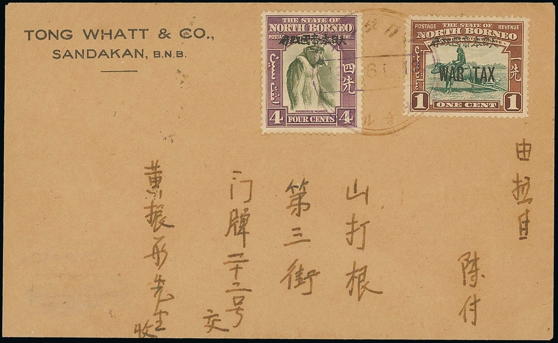 1c. green and red-brown used with 4c. bronze-green and violet, both with black overprint, tied by Sandakan Japanese type c.d.s. in violet on 1943 (19 June) envelope addressed to Tawau and showing, on reverse, black censor chop. B.P.A. Certificate (2003). S.G. J4a, J16. Photo