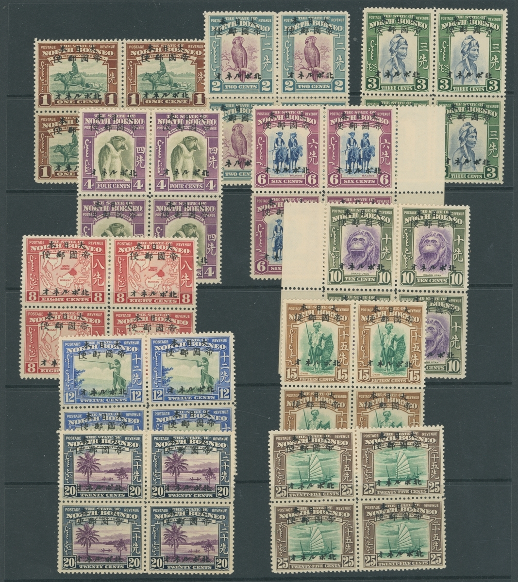 1c. to $1 set of thirteen in singles with additional 2c., 4c. and 20c. (the first and last with small faults), plus 1c. to 25c. in blocks of four and 2c. half sheet of fifty, fine mint; also mint 1943 Pictorial 4c. (5 including a pair; one lightly toned and with corner fault) and 8c. ISC J18-J32, $4,400+; S.G. J18-J32, £1,634