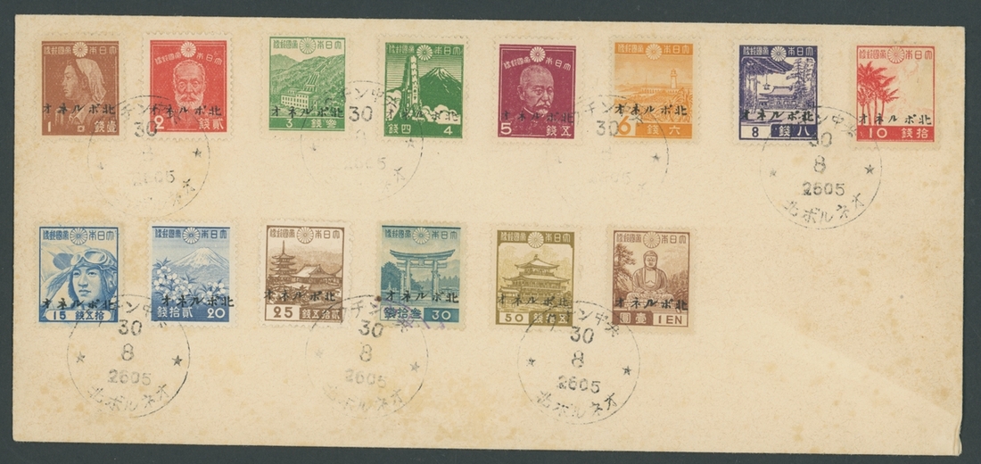 1s. to 1y set of fourteen on unaddressed envelope (very lightly foxed) tied by Kuching Japanese c.d.s. (30.8.45), fine. ISC J37-J50, $2,400; S.G. J35-J48, £750