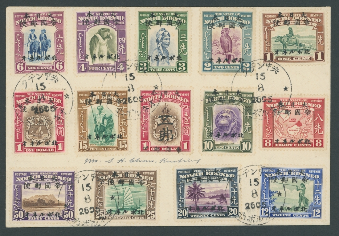 1944 (2 Oct.) large locally addressed Kuching envelope, bearing 1944 (Sept.) 1c. to $1 set of thirteen and 1944 on Japan 30s. with Brunei 5c., all tied by Japanese type c.d.s. (Type JD4) and showing violet censor chop; the envelope with worm hole at right, well clear of adhesives, and four punch holes at foot