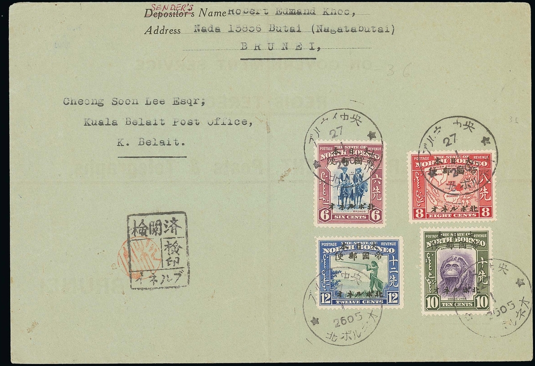 1945 (27 Jan.) envelope from Brunei to Kuala Belait, bearing 1944 (Sept.) 6c., 8c., 10c. and 12c., each tied by Brunei Japanese type c.d.s. (JD3) and showing black censor chop. Photo