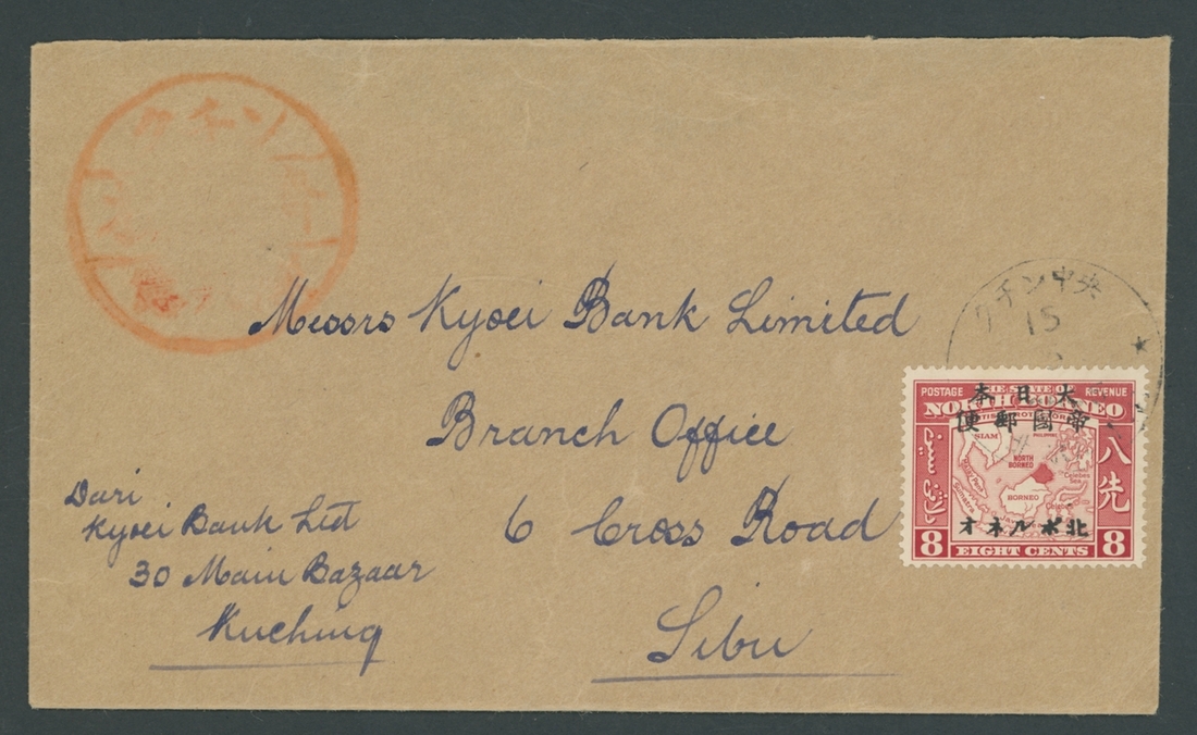 1945 (15 May) envelope from Kuching to Sibu, bearing 1944 (Sept.) 8c. tied by Japanese type c.d.s. (Type JD4) and showing large circular Military censor chop in red at top left