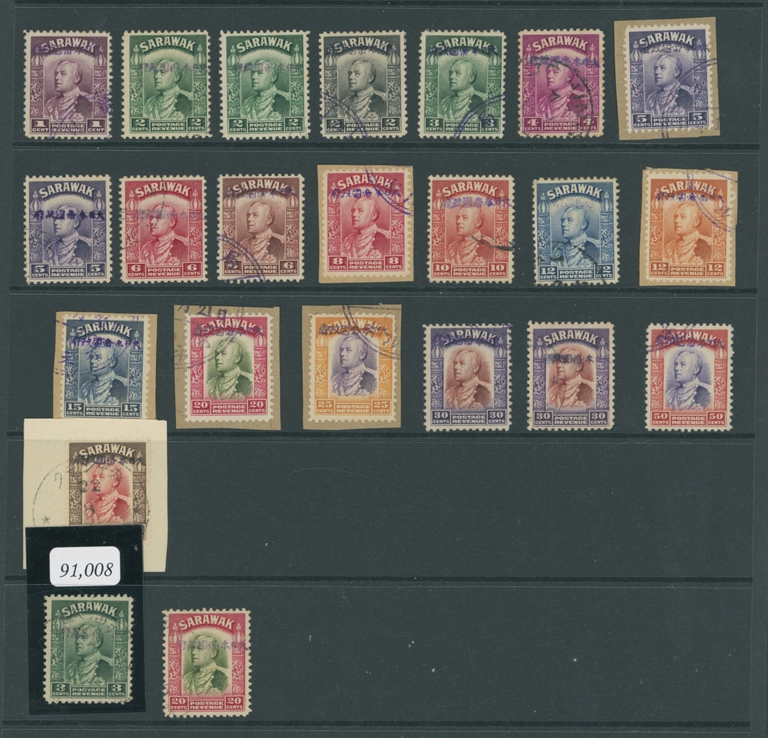 1c., 2c. green (2), 2c. black, 3c. green (2, one with B.P.A. certificate, 2018), 4c., 5c. (2), 6c. carmine, 6c. lake-brown, 8c. carmine, 10.,12c. blue, 12c. orange, 15c. blue, 20c. (2), 25c., 30c. (2), 50c. and $1, all with violet overprint, seven on small pieces, fine used. ISC cat. $11,080; S.G. cat. £4,030