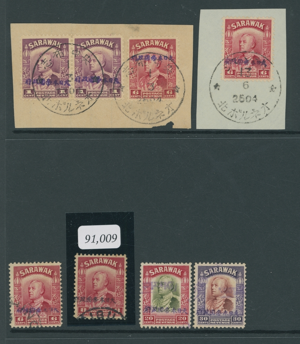 1c. pair on piece with Kuching overprint 6c. carmine, 6c. carmine (2, one on piece), 20c. (a few short perfs at top) and 30c. with violet overprint, and 8c. carmine with black overprint (B.P.A. certificate, 2018), fine used. ISC cat. $4,500; S.G. cat. £1,830