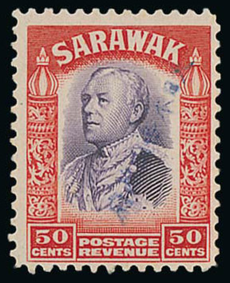 50c. violet and scarlet with diagonal blue overprint, unused with dried original gum, vertical crease in right margin otherwise fine. B.P.A. Certificate (2015). Unlisted in ISC; S.G. J20b, £1,000. Photo