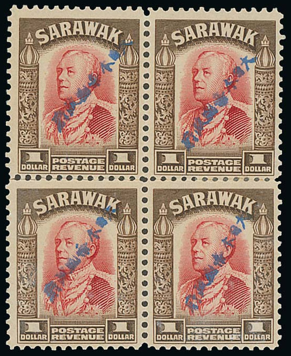 $1 scarlet and sepia block of four with margin at left (detached) and diagonal blue overprint, unused with full original gum, some split perfs at left, fine. A rare multiple. B.P.A. Certificate (2015). ISC J21d, $8,000; S.G. J21a, £3,000. Photo