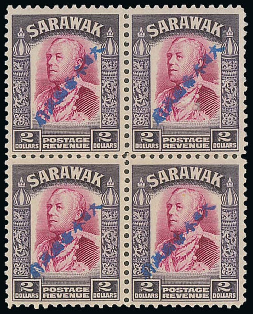 $2 bright purple and violet block of four with diagonal blue overprint, unused with large part original gum, two light creases not affecting fine appearance. A rare multiple. B.P.A. Certificate (2015). ISC J22c, $8,000; S.G. J22a, £3,000. Photo