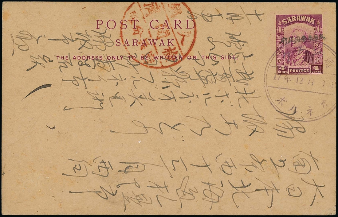 1943 (17 Dec.) 4c. stationery card with black overprint to Japan, cancelled by Kuching Japanese type c.d.s. (Type JD1) in violet and showing red circular censor chop. Rare. B.P.A. Certificate (2017). Photo