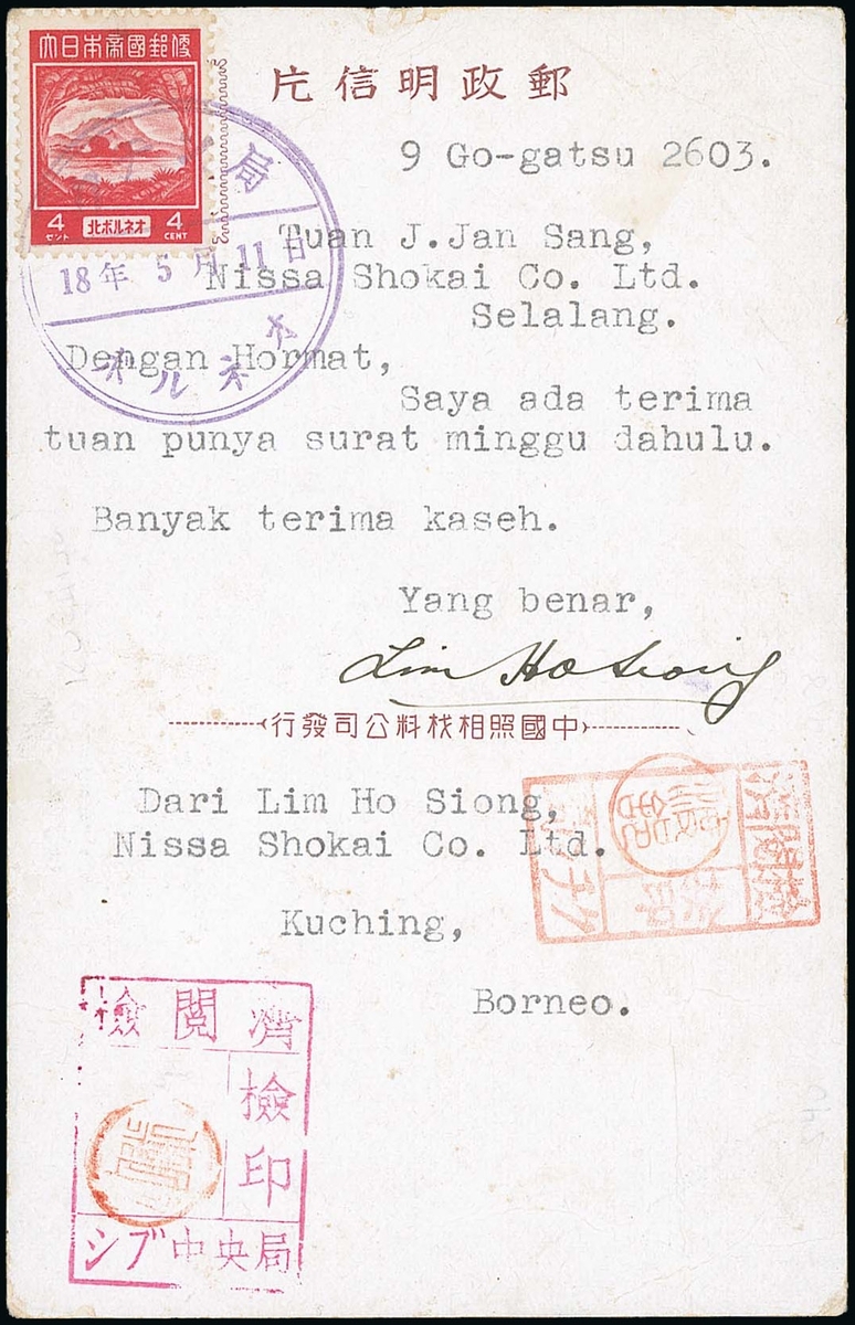 1943 (11 May) Japanese picture postcard (view of Amoy) bearing 1943 Pictorial 4c. tied by Kuching Japanese type c.d.s. in violet (Type JD1) and showing two different censor chops; the card with light corner crease which affects the adhesive. B.P.A. Certificate (2017). Photo