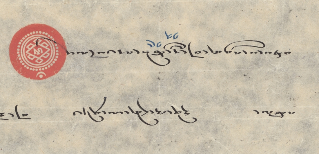 1900-20 letter to the King of Nepal (50x59 cm) with the endless knot personal seal of the Dalai Lama (Dawson 5) covered with a paper fragment; fine. This seal was used on letters to official friends and is scarce. Photo