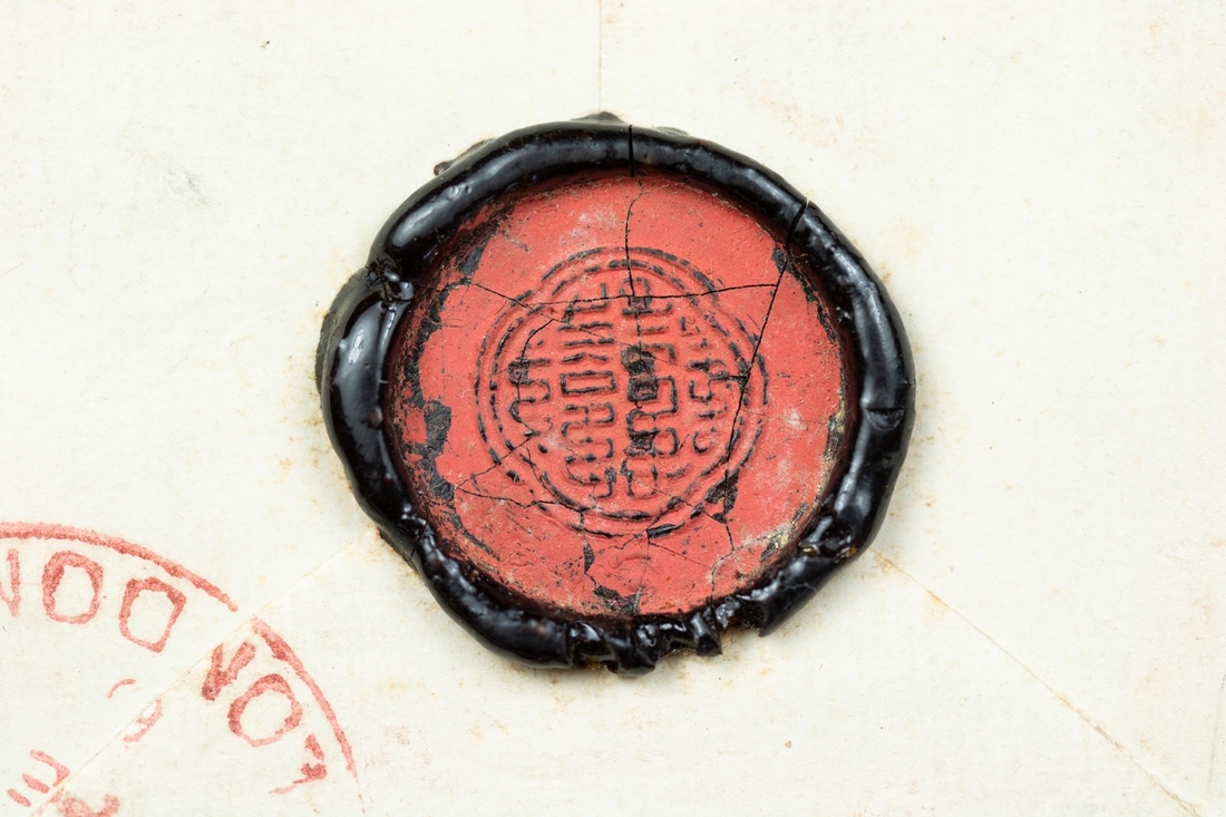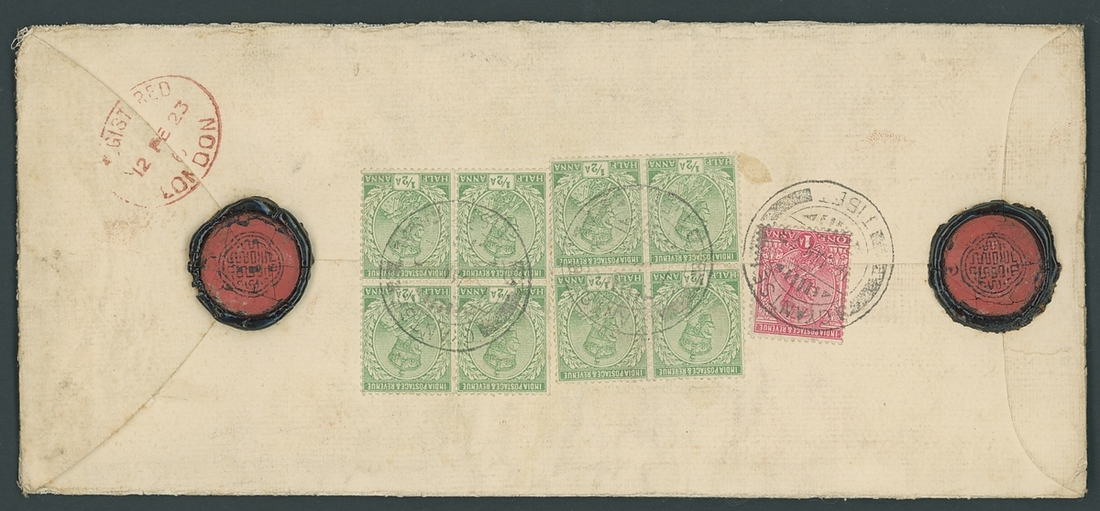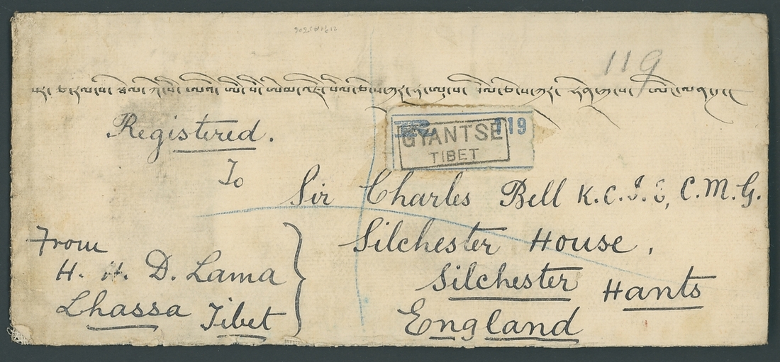 1923 (Jan.) white, linen-lined envelope registered to Sir Charles Bell in Hampshire, "from H.H. D.Lama, Lhassa, Tibet" with Gyantse type GE handstamp on registration label, the reverse with two superb examples of the Dalai Lama's seal with dot and crescent (Dawson 6) with India K.G.V ½a. (8) and 1a. tied by Gyantse (16.1) c.d.s. with London registered oval (12.2) in red. Fine and rare. Considered by Waterfall as one of the finest piece of the seals. Photo