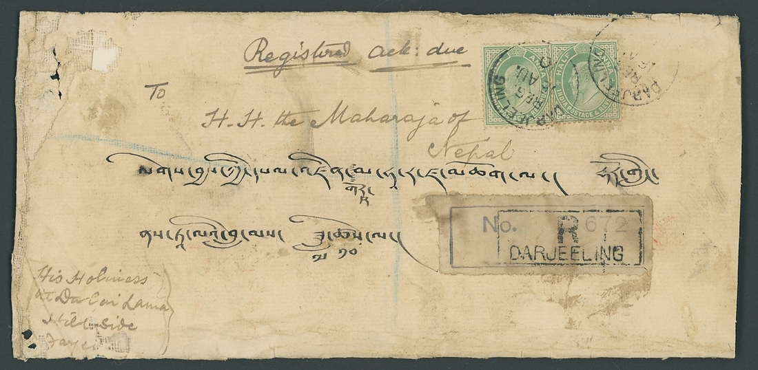 1910 (16 Aug.) registered envelope from the Dalai Lama in Darjeeling to the Maharaja of Nepal bearing, on the address side, India K.E.VII ½a. pair tied by Darjeeling c.d.s. with the registration label below, the reverse with India 1a. (3), three superb floral seals of the Dalai Lama (used when in exile) and Nepal arrival c.d.s. (21.8); folding crease and some edge wear. Marked in the corner of the address side, "His Holiness the Dalai Lama, Hillside, Darjeeling". Fine and an important and scarce cover. Photo