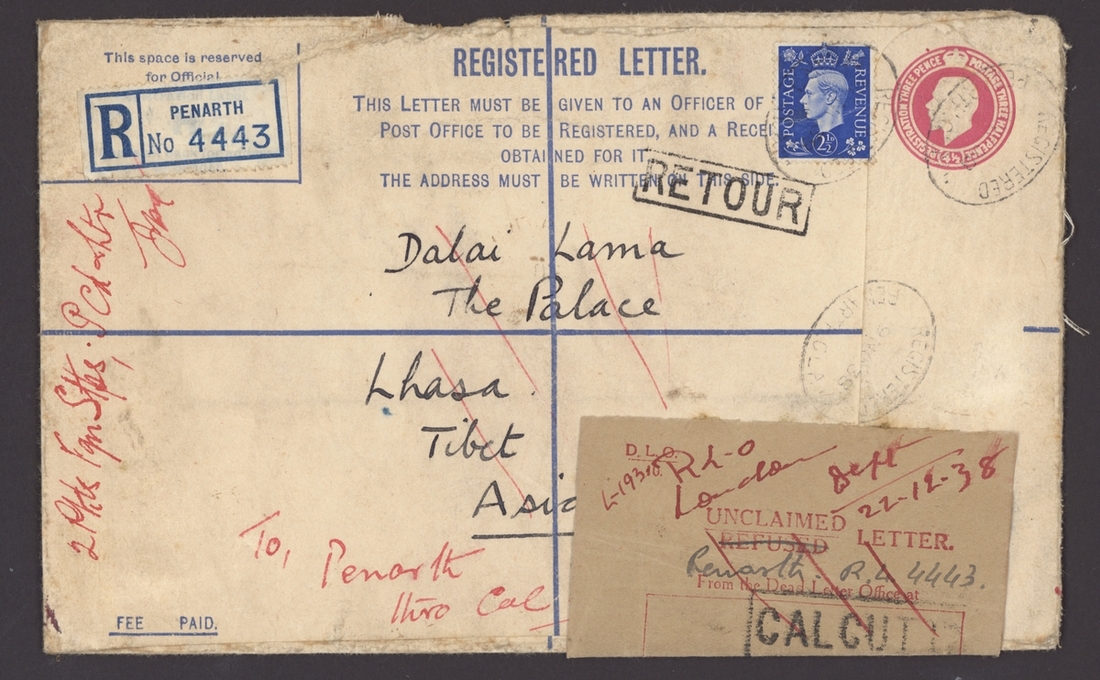 1938 (9 Nov.) G.B. 4½d. registered envelope uprated 2½d. from Penarth to "Dalai Lama, The Palace, Lhasa, Tibet ..." with Calcutta D.L.O. unclaimed label, and boxed "