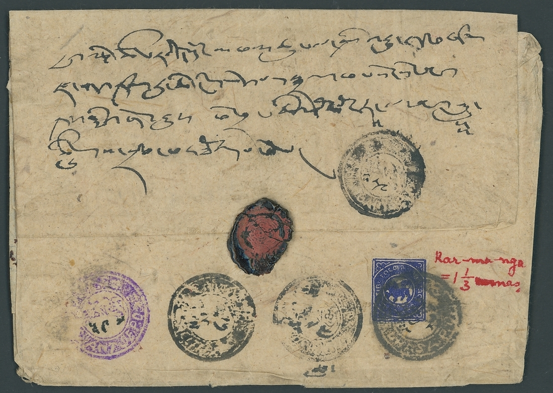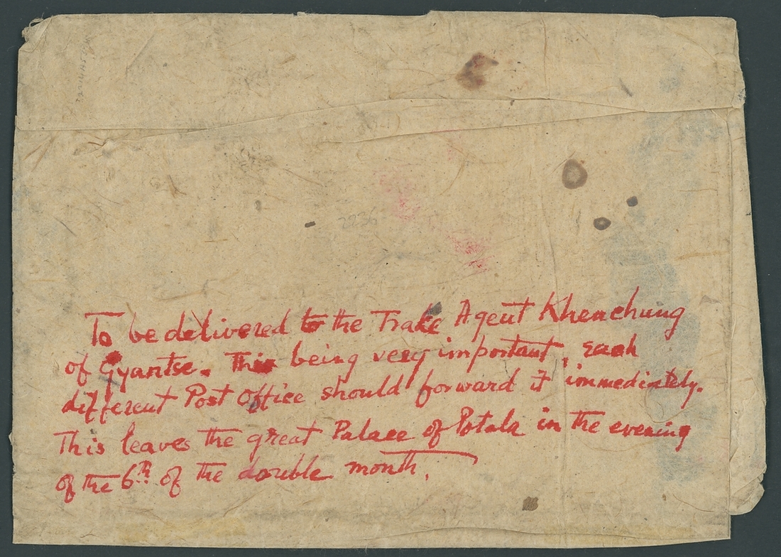 1920 (c.) shirt wrapper to the Trade Agent in Gyantse bearing 2/3 tr. bright blue tied by Lhasa type 1 postmark with similar for Chushu, Pelti, Nangartse and Gyantse in violet, with the crossed thunderbolts seal (Dawson 7); the address has been translated on the reverse including, "This being very important, each different Post Office should forward it immediately. This leave the great Palace of Potala in the evening of the 6th of the double month". A good cover. Photo