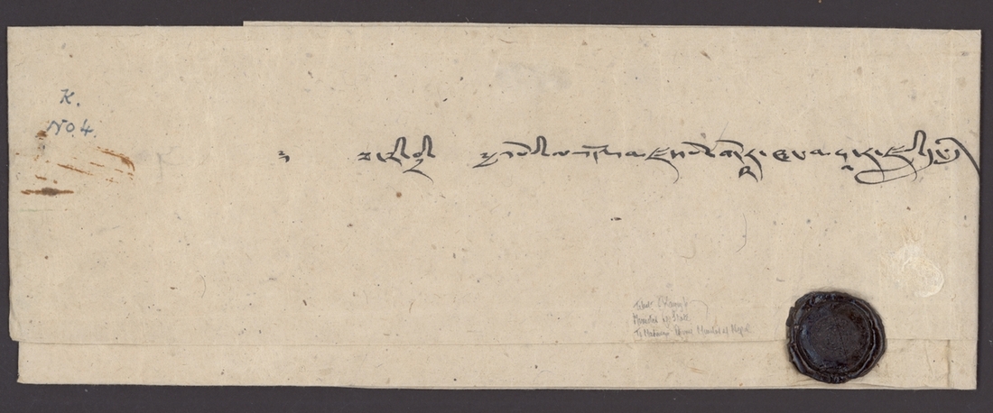 Large wrapper to the King of Nepal bearing a fine and complete black wax seal of the Kashag (Dawson 12); fine