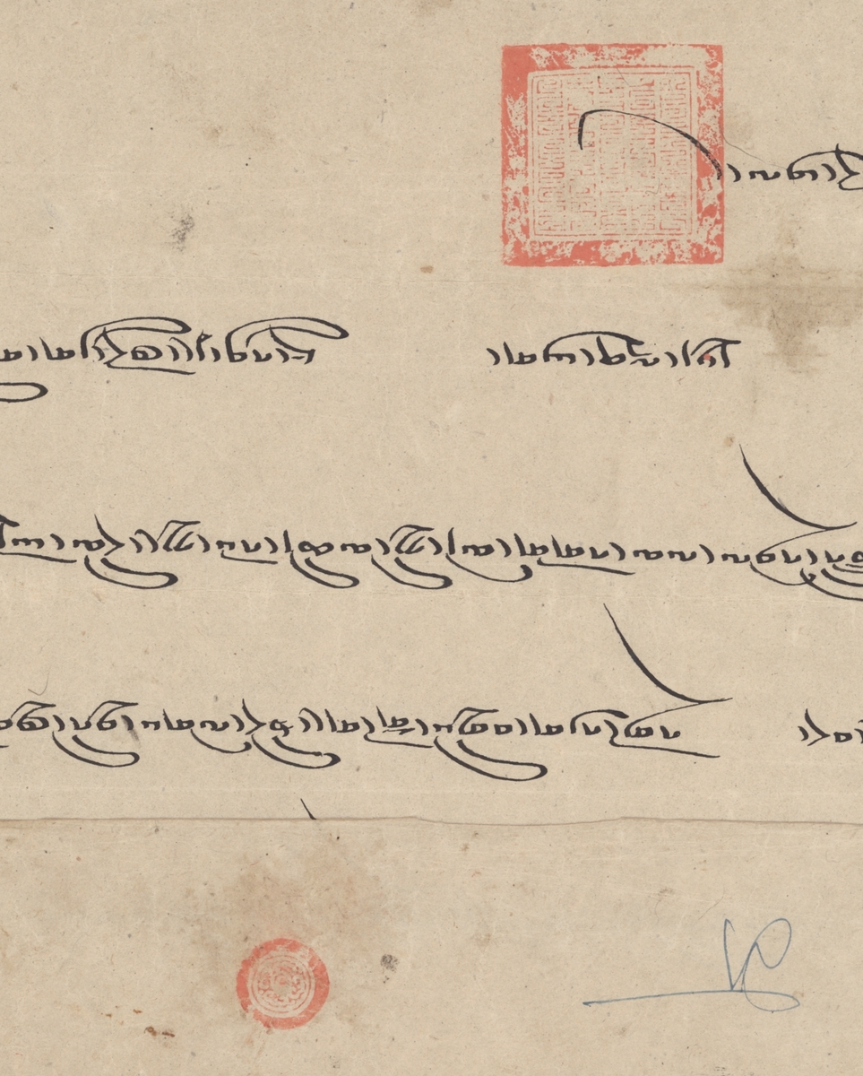 1858 scarf letter to the King of Nepal, sealed at the end with the square ink seal (35 x 35mm) with five lines of Horyig script of the third Reting Rinpoche, with his small, personal seal in a floral design on the outside of the wrapper. In this letter he informs the King that he rules on Tibet at the wishes of the Chinese Emperor. A good letter. Photo