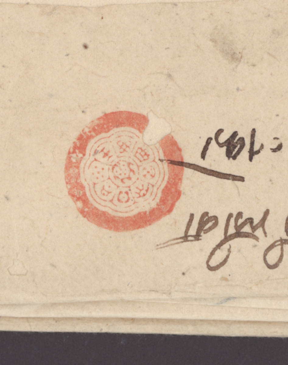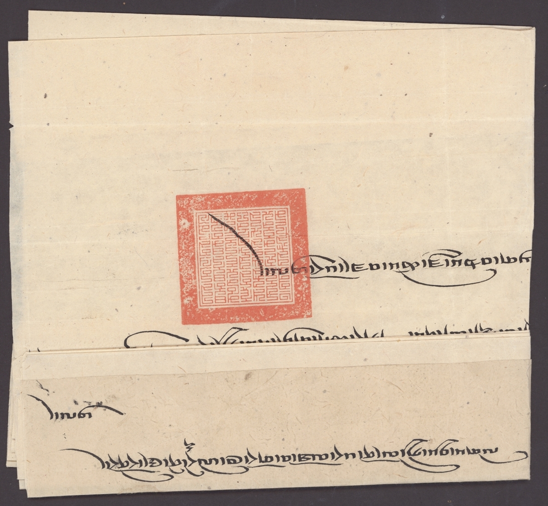 1904 (c.) scarf letter to the King of Nepal bearing a superb strike of the large seal with seven lines of Horyig script (47x47 mm), the outside with his personal seal (Dawson 21) with a floral design in centre surrounded by eight auspicious signs (a tiny fragment missing). Very scarce. Photo