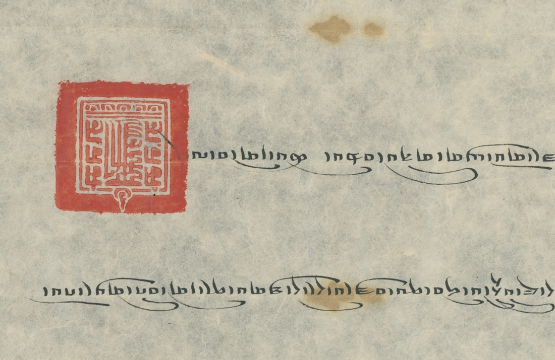 Early folded scarf letter to Nepal bearing a superb strike of the Panchen Lama's 16mm personal seal, the letter concludes with a fine strike of the official seal (Dawson 26). Slightly worm eaten in places and some minor soiling. Fine and rare. Photo